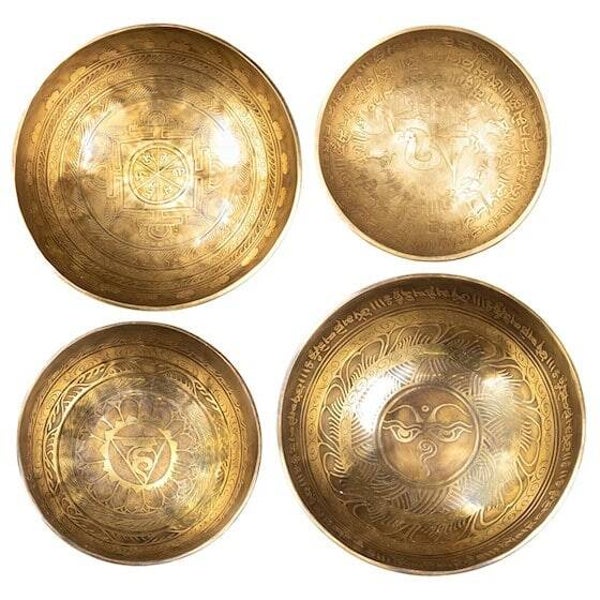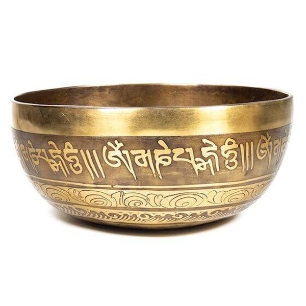Handgemaakte klankschaal uit Nepal. Prachtig gegraveerd met o.a. de Om Mani Pad Me Hum mantra, aan zowel de buiten- als de binnenzijde. Heeft een zuivere klank met veel boventonen.