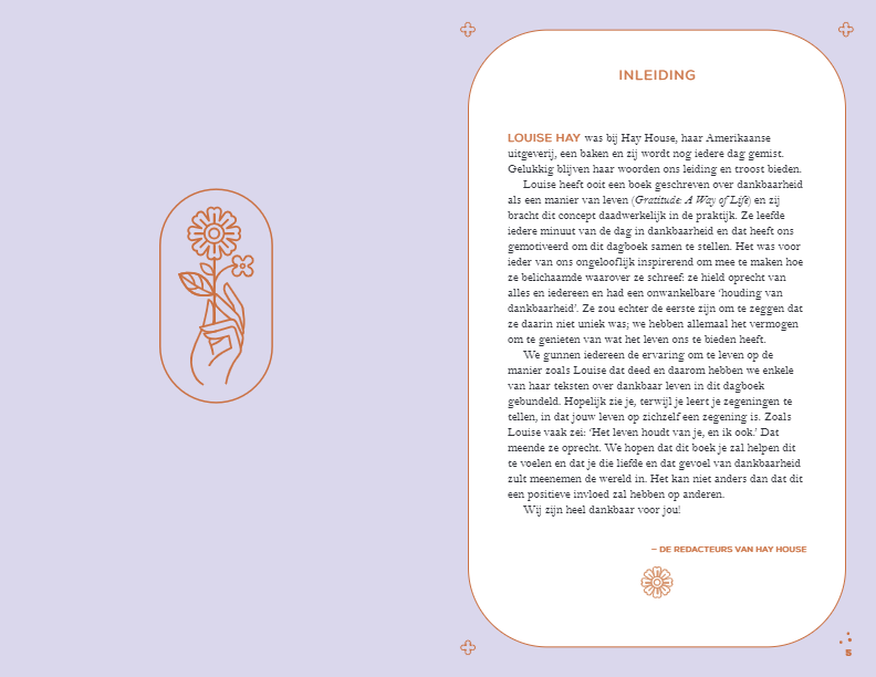 In De gave van dankbaarheid vind je mooie boodschappen en waardevolle gedachten van Louise Hay over zelfliefde, vreugde en leven in dankbaarheid. Het biedt motiverende (schrijf)oefeningen, zoals je eigen affirmaties maken, effectief visualiseren, vergeven en loslaten. Terwijl je leert om van jezelf te houden, zul je merken dat je manier van denken verandert, en dat de wereld om je heen gevuld is met liefde, vreugde, voorspoed, inspiratie en avontuur.