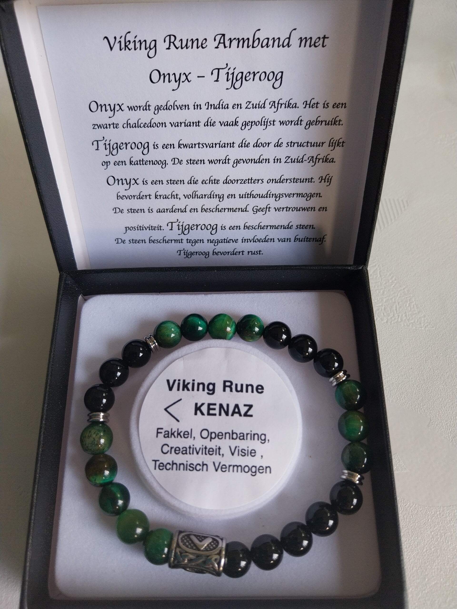 Heren armband Kenaz, van natuursteen Onyx en groene Tijgeroog met Viking kraal.