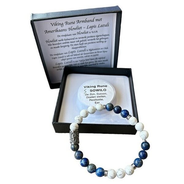 Heren armband Sowilo, van natuursteen Amerikaans Howliet en Lapis Lazuli met Viking kraal
