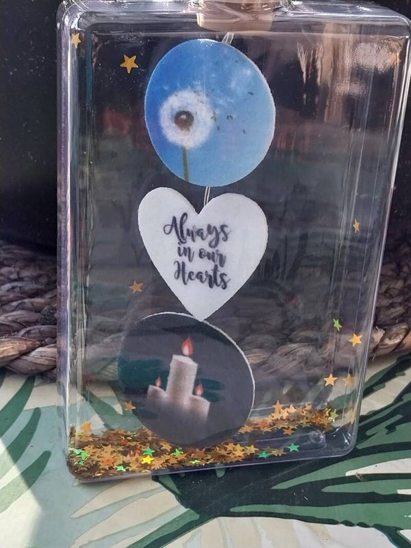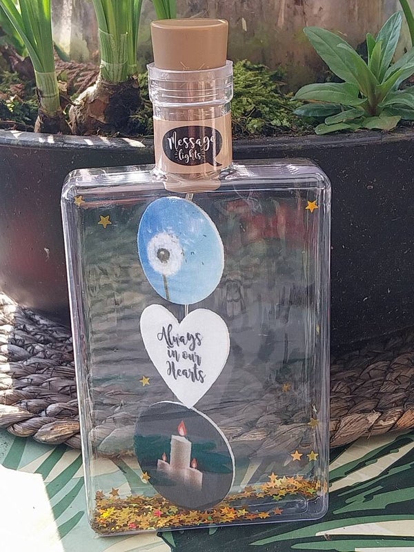 Flesje met lampjes en vilten figuurtjes in condoleance thema.